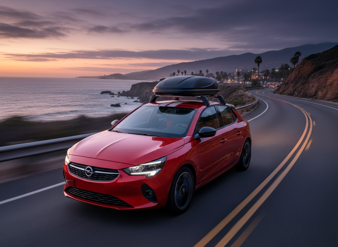 Coffre de toit compacte et intelligent avec couvercle en aéroskin noir et logo Opel.