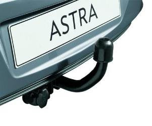 Crochet d'attelage en acier couleur noir, spécialement conçu pour l'Opel Astra avec crochet d'attelage fixe.