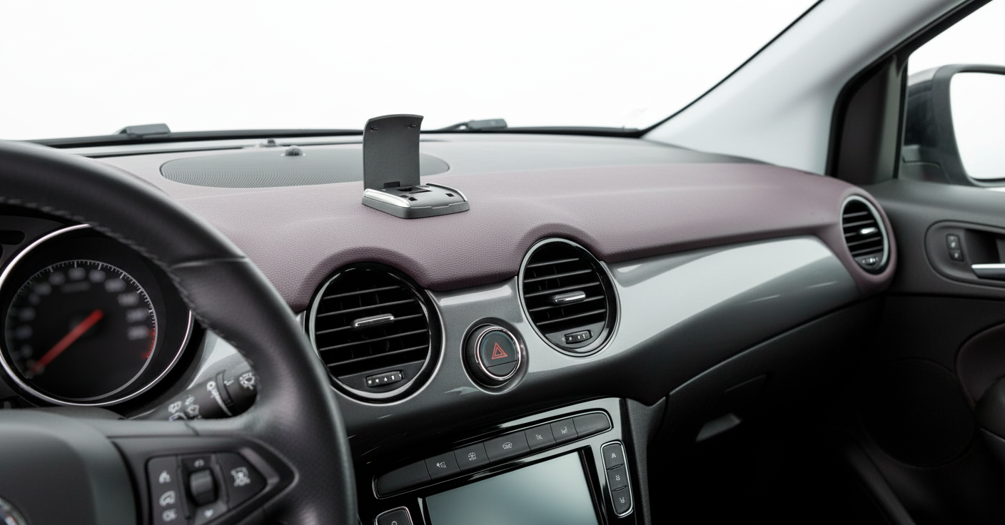 L' embase se fixe facilement sur le tableau de bord du véhicule et assure une fixation sûre et stable.